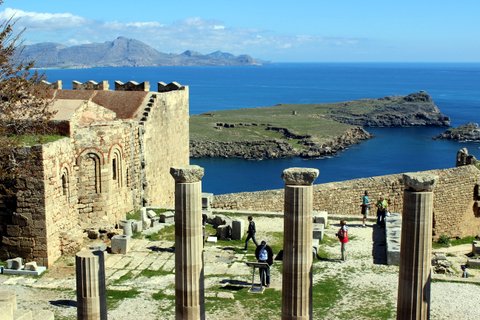 Dropped off on a hill above the town square, we trekked down to the tiny medieval village and then scaled the winding 300 steps upward to the exquisite archaeological site of Lindos.