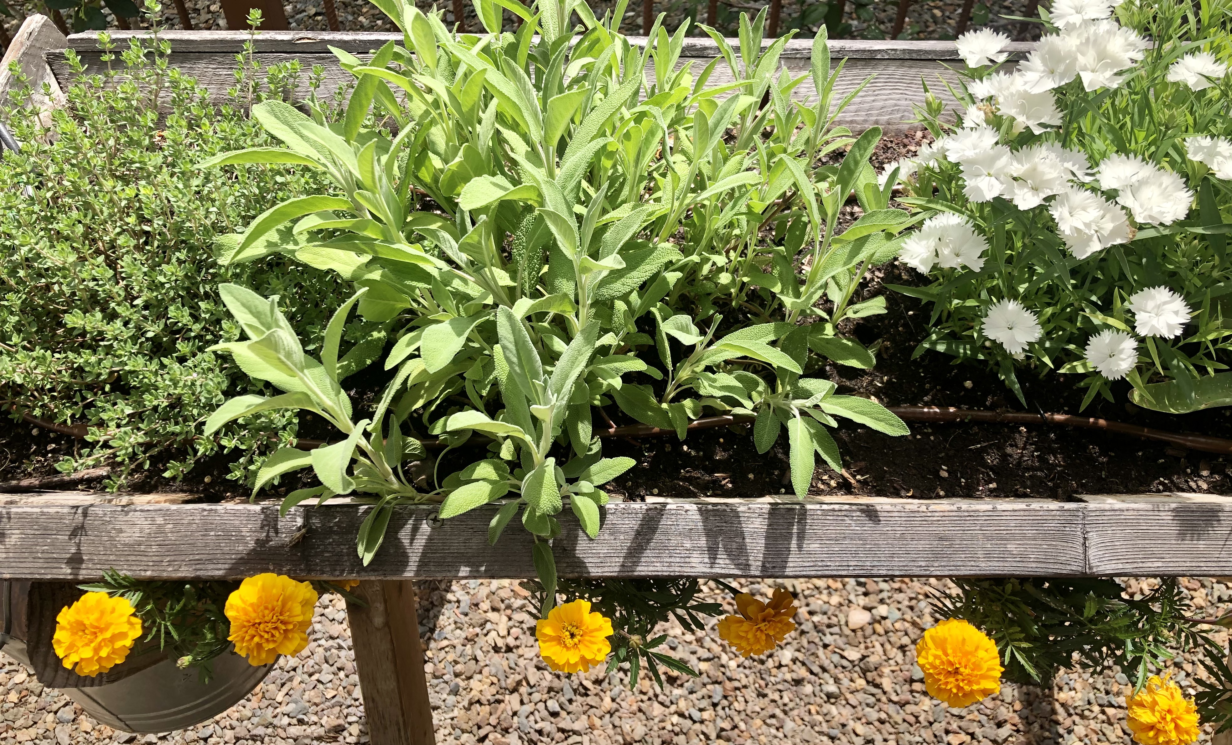 Thyme and sage spill forth alongside dianthus and marigolds.